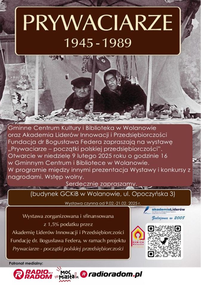 Gminne Centrum Kultury i Biblioteka w Wolanowie i Akademia Liderów Innowacji i Przedsiębiorczości Fundacja dr Bogusława Federa zapraszają na wystawę „Prywaciarze – początki polskiej przedsiębiorczości.
