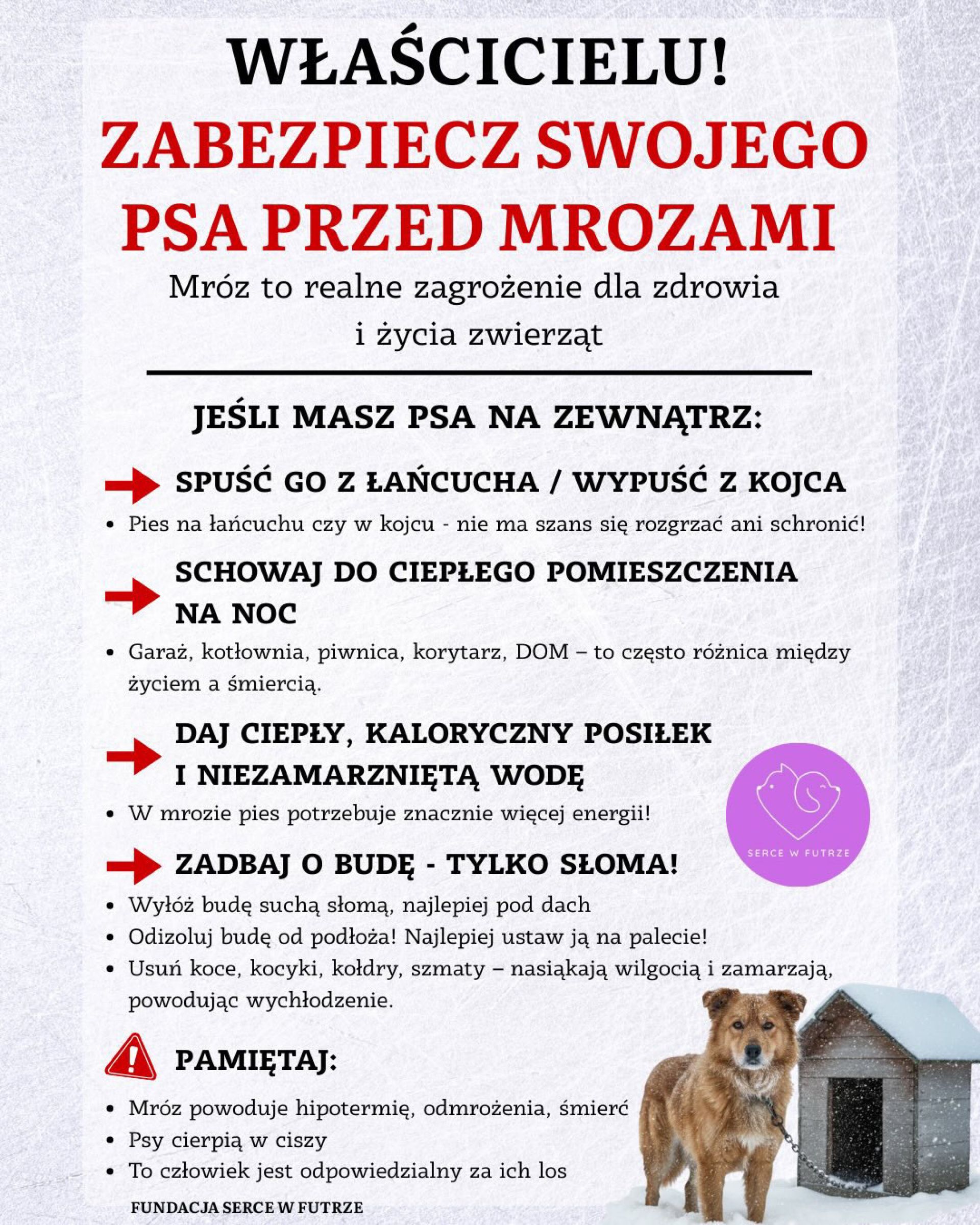 W związku z utrzymującymi się niskimi temperaturami apelujemy do właścicieli zwierząt domowych, w szczególności psów o odpowiednie zabezpieczenie ich przed skutkami mrozu. Mróz może stanowić zagrożenie dla zdrowia i życia psów, szczególnie tych przebywających na zewnątrz.